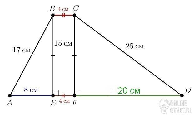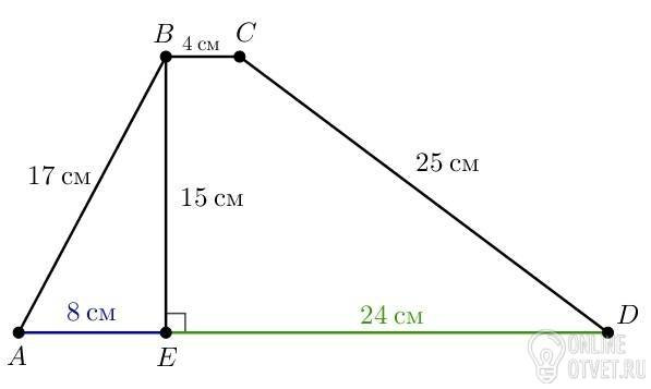 В условии ошибка: трапеции с такими сторонами быть не может. Правая сторона должна равняться 25 см, чтобы все остальные числа оставались такими.