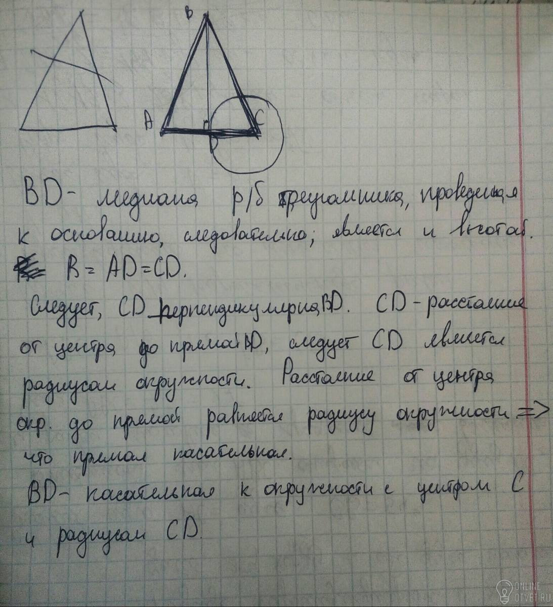 В равнобедренном треугольнике АВС с основанием АС проведена медиана BD. Докажите что прямая BD касается окружности с центром С и радиусом равным AD.