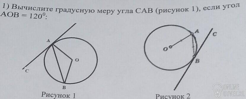 Поскольку AOB центральный угол, то дуга AB = 120 градусов. а угол CAB, это угол между дотичной и хордой, CAB = 1/2 AB = 60 градусов