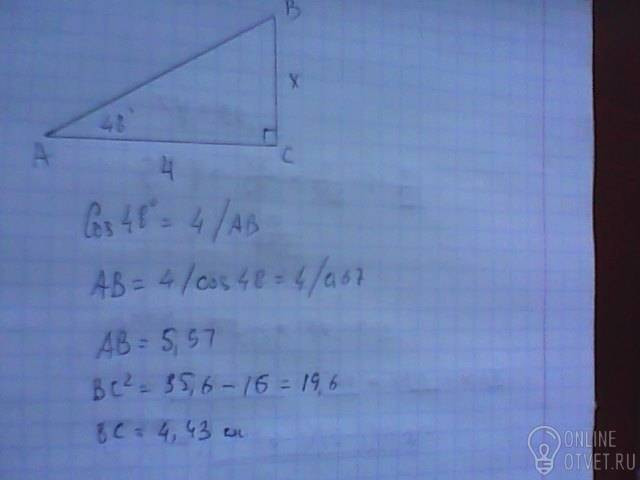У прямокутному трикутнику ABC( кут C=90°) кут CAB=48°, AC=4 см. Знайдіть BC.