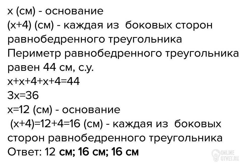 Периметр равнобедренного треугольника равен 44 , а одна из его сторон больше другой на 8 . найти стороны треугольника
