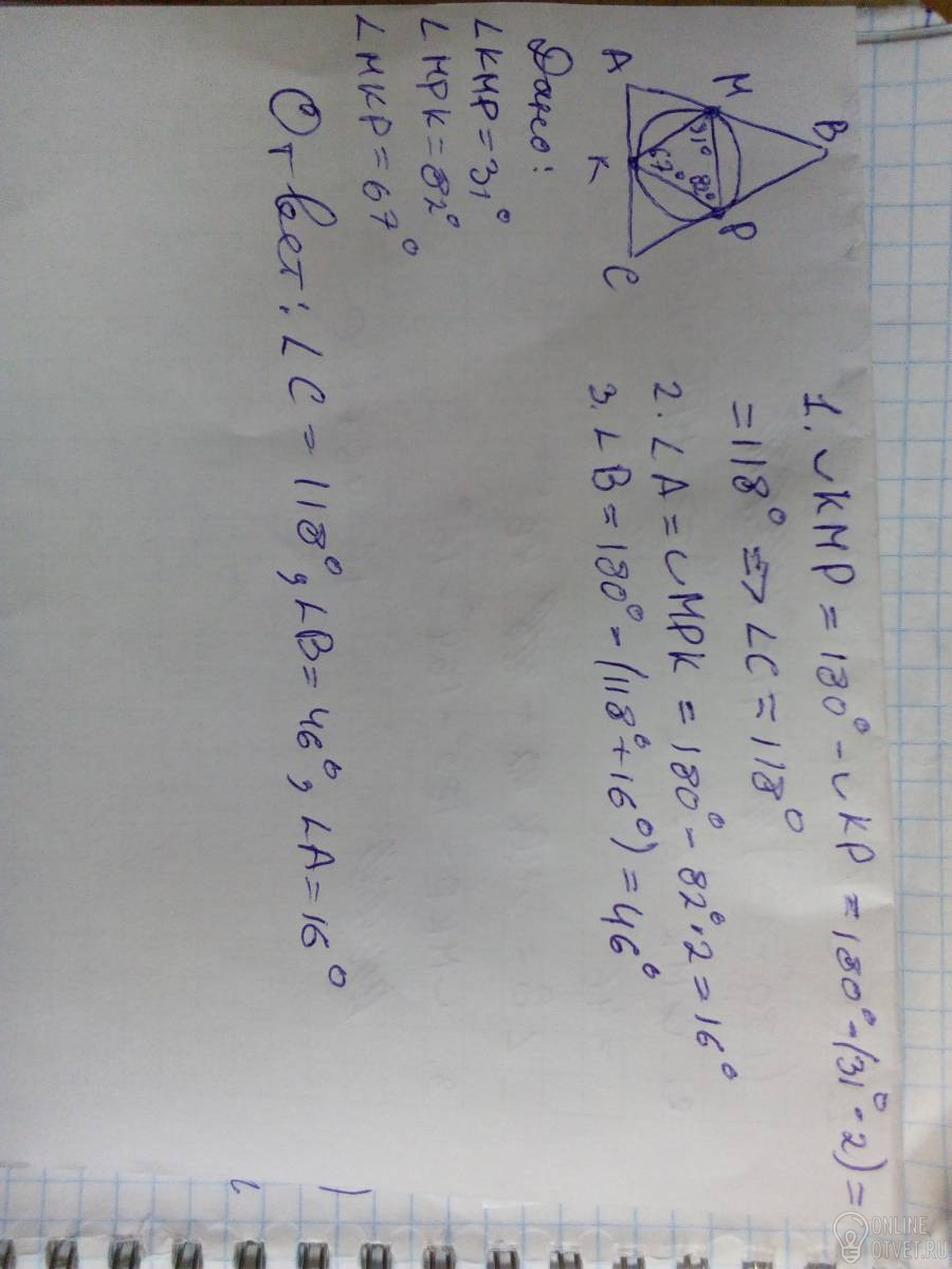 Окружность, вписанная в треугольник ABC, касается его сторон в точках M,K и P. Найдите углы треугольника ABC, если углы треугольника MKP равны 31градус, 67 и 82