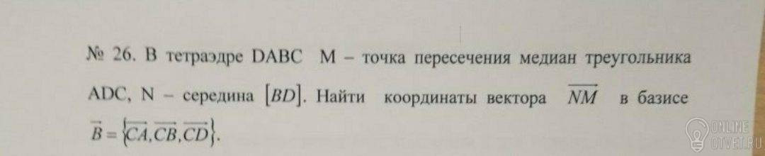 А = САD = CDC = 0Середина стороны ADp = (A + D)/2 = (CA + CD)/2Медиана СpСp = p - C = (CA + CD)/2Медианы точкой пересечения делятся как 2 к 1 от вершины угла, из которого построеныСМ = 2/3*Сp = (CA + CD)/3N - середина ВDN = (CB + CD)/2NM = M - N = (CA + CD)/3 - (CB + CD)/2 = CA/3 + CD/3 - CB/2 - CD/2NM = CA/3 - CD/6 - CB/2