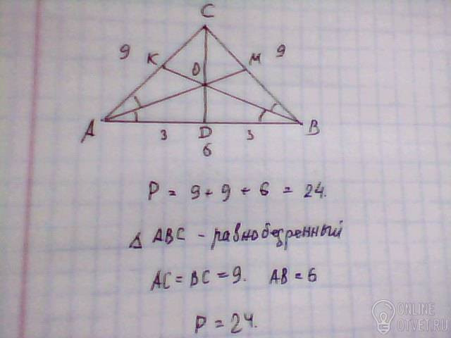 Дан треугольник ABC. AM и BK - биссектрисы, AM=BK, AB=6 см, BC=9 см. Найдите периметр треугольника ABC.