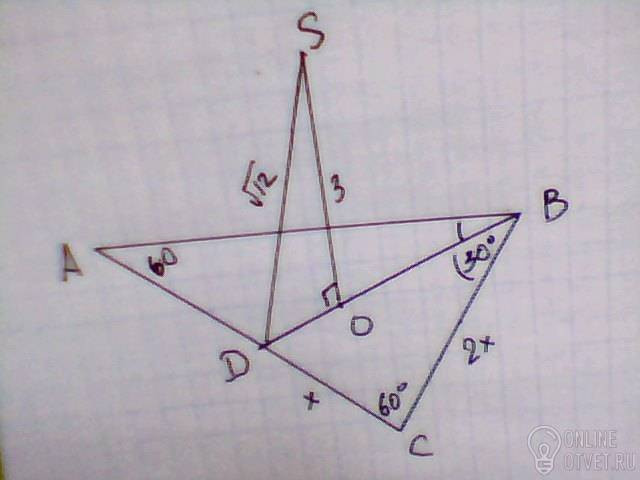 ΔSОD. ОD²=SD²-ОS²=12-9=3; ОD=√3 см.