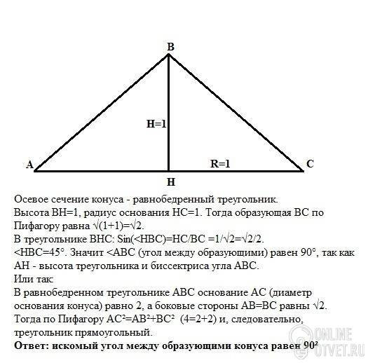Высота конуса 1м. Радиус основания 1м. Каков угол между образующими при вершине конуса?