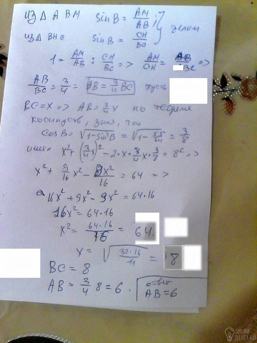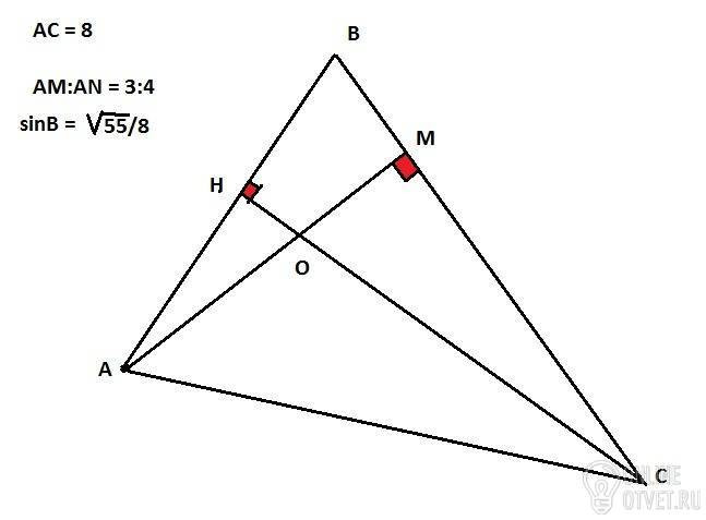 В остроугольном треугольнике ABC проведены высоты AM и CH , причем AM:CH=3:4. Найдите меньшую сторону треугольника , если AC =8 , sin ∠B =.
