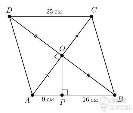 См. рисунок. Диагонали ромба перпендикулярны, поэтому треугольник Δ AOB прямоугольный, а отрезок OP — его высота. Найдём её. Высота прямоугольного треугольника равна среднему геометрическому отрезков, на которые она делит гипотенузу: