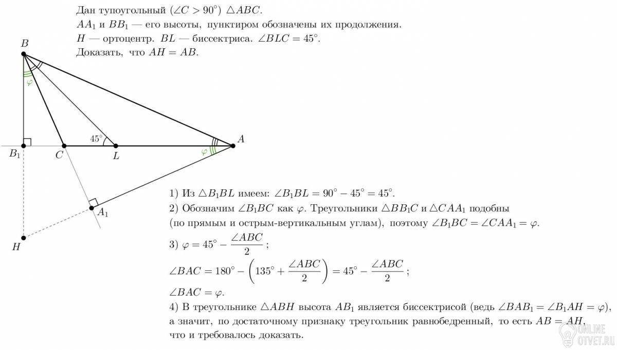 В треугольнике АВС, в котором есть тупой угол С, провели биссектрису ВL. Угол ВLC = 45. Высоты А и В пересекаются в точке Н. Докажите, что АН = АВ