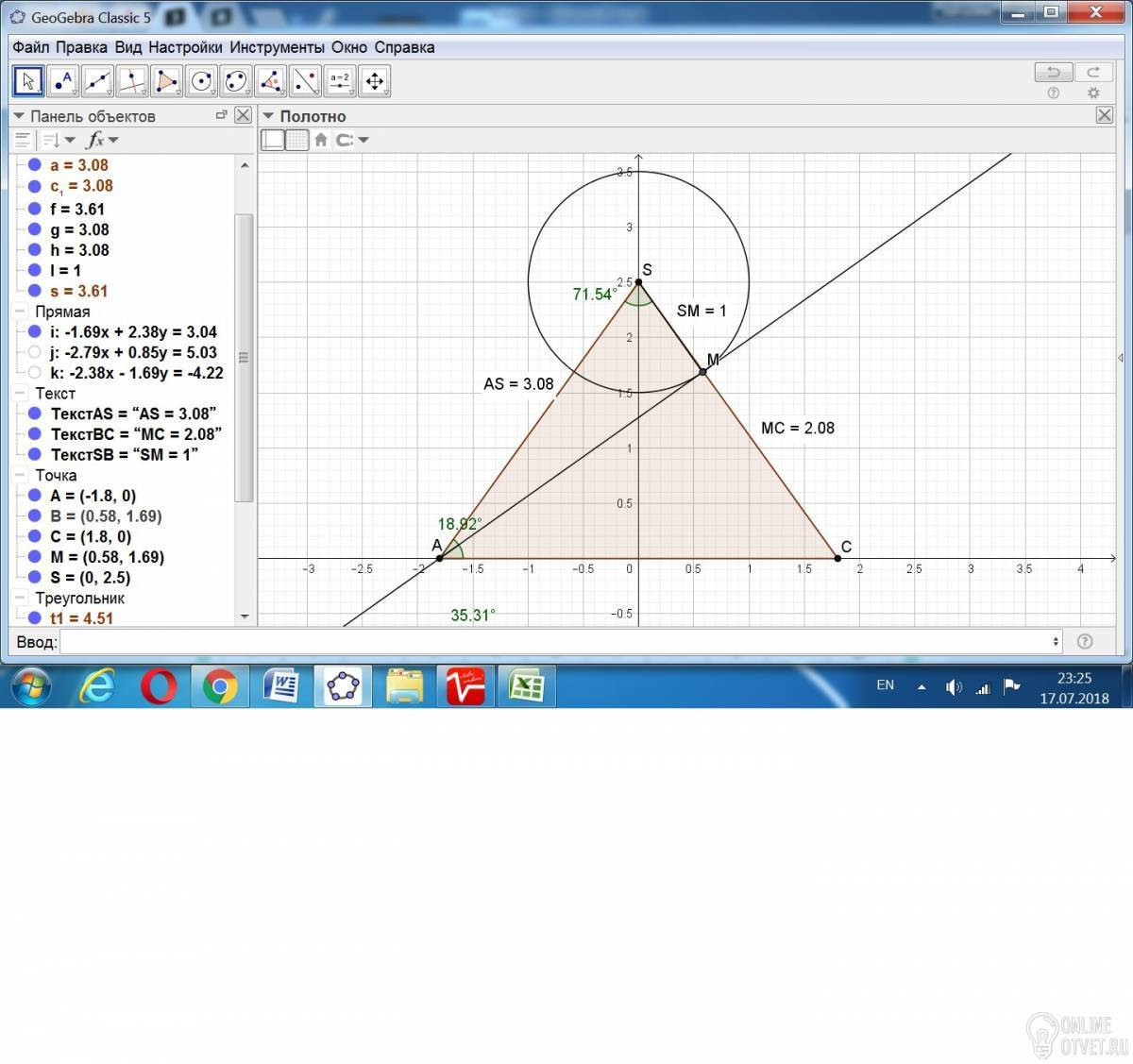 Как видим, угол между ребром SC и перпендикуляром к касательной к окружности R = 1 равен 0,464884873 градуса.