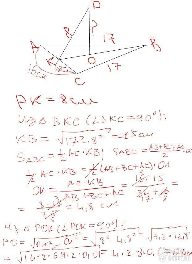 В равнобедренном треугольнике abc ab=bc=17 см, ac=16 см.Точка P находиться на расстоянии 8 см от всех сторон треугольника abc.Найти расстояние от точки Р к площади треугольника