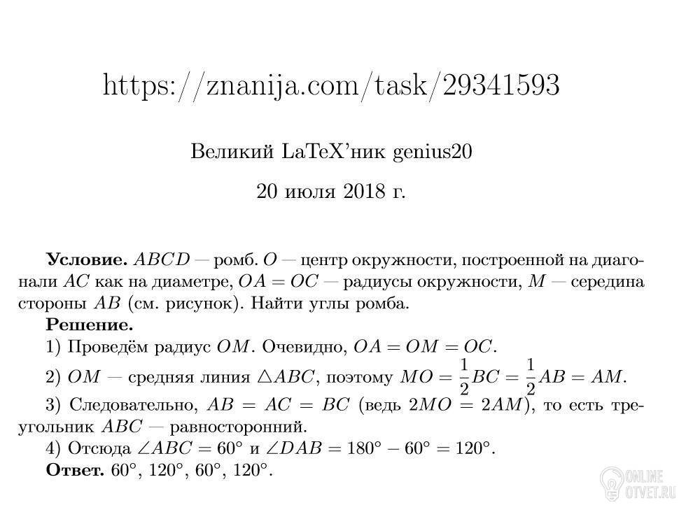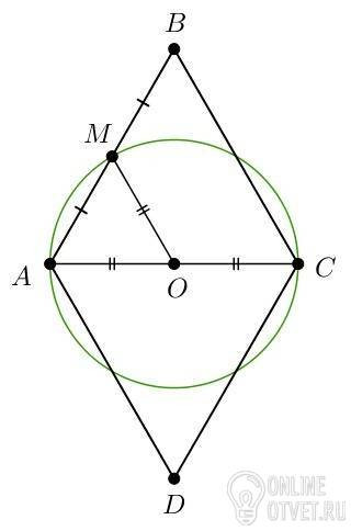 Коло побудоване на діагоналі ac ромба abcd, як на діаметрі проїодить через середигу сторони ab. Знайдіть кути ромба
