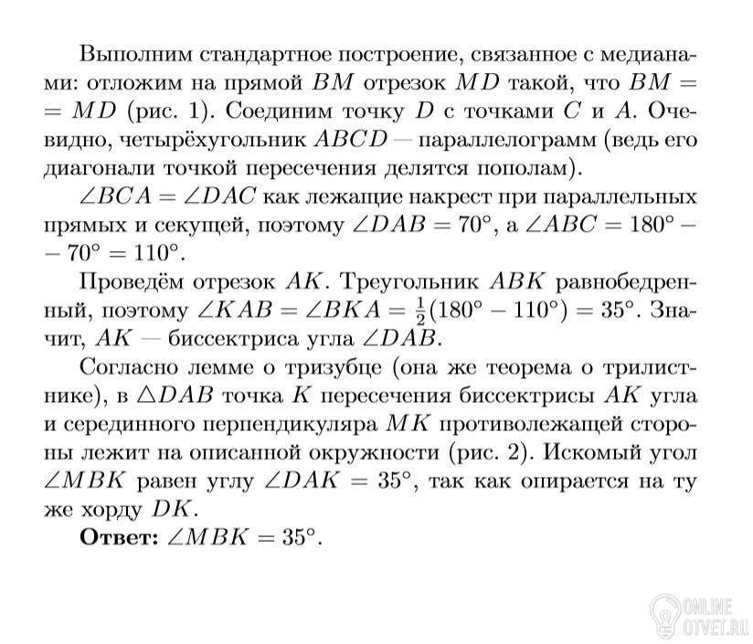 Найдите ∠MBC, если ∠A + ∠C = 70◦