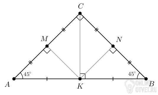 В равнобедренном треугольнике высота, опущенная на основание, является также и медианой, поэтому AK=KB (см. рисунок). В прямоугольном треугольнике медиана, опущенная на гипотенузу, равна её половине, поэтому CK=AK=KB. Следовательно, треугольники ACK и CBK тоже равнобедренные. Это значит, что MK и NK являются и высотами, и медианами. Следовательно, это средние линии треугольника ABC (ведь они проходят через середины двух сторон и параллельны третей).