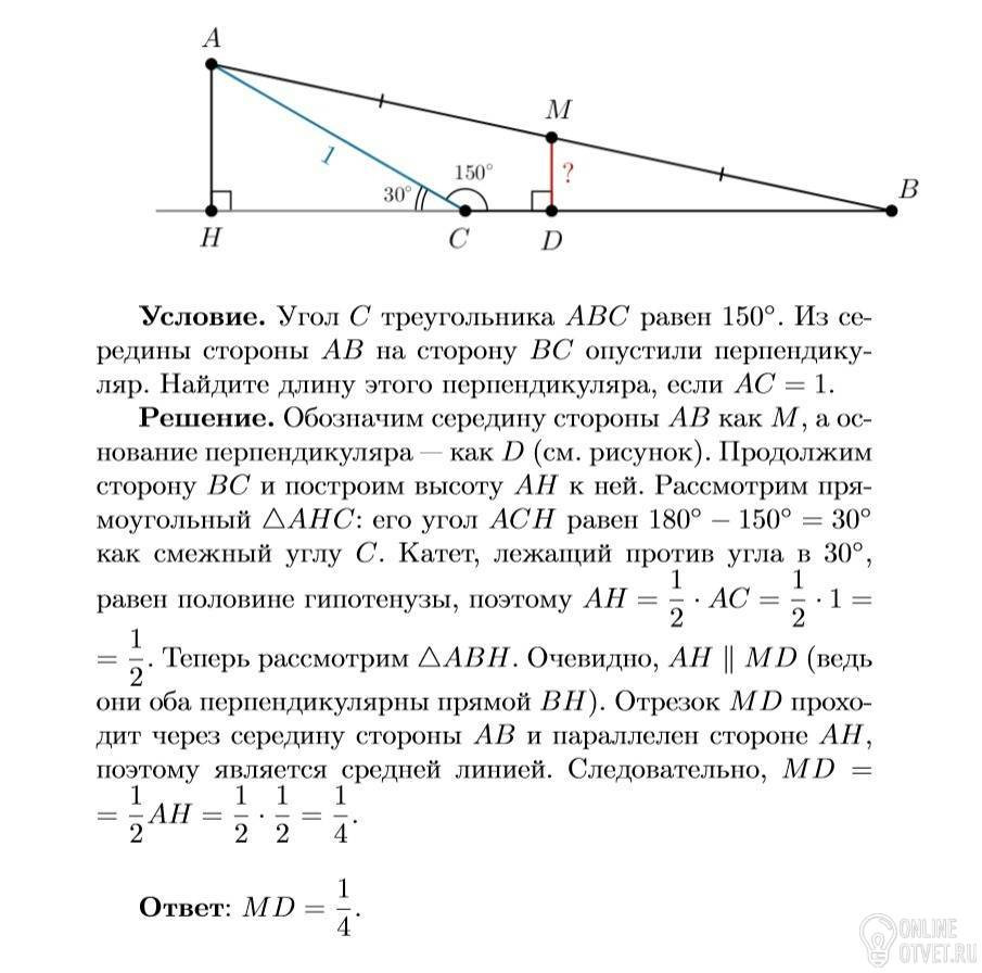 Угол C треугольника ABC равен 150 градусов . Из середины стороны AB на сторону BC опустили перпендикуляр . Найдите длину этого перпендикуляра, если AC = 1