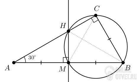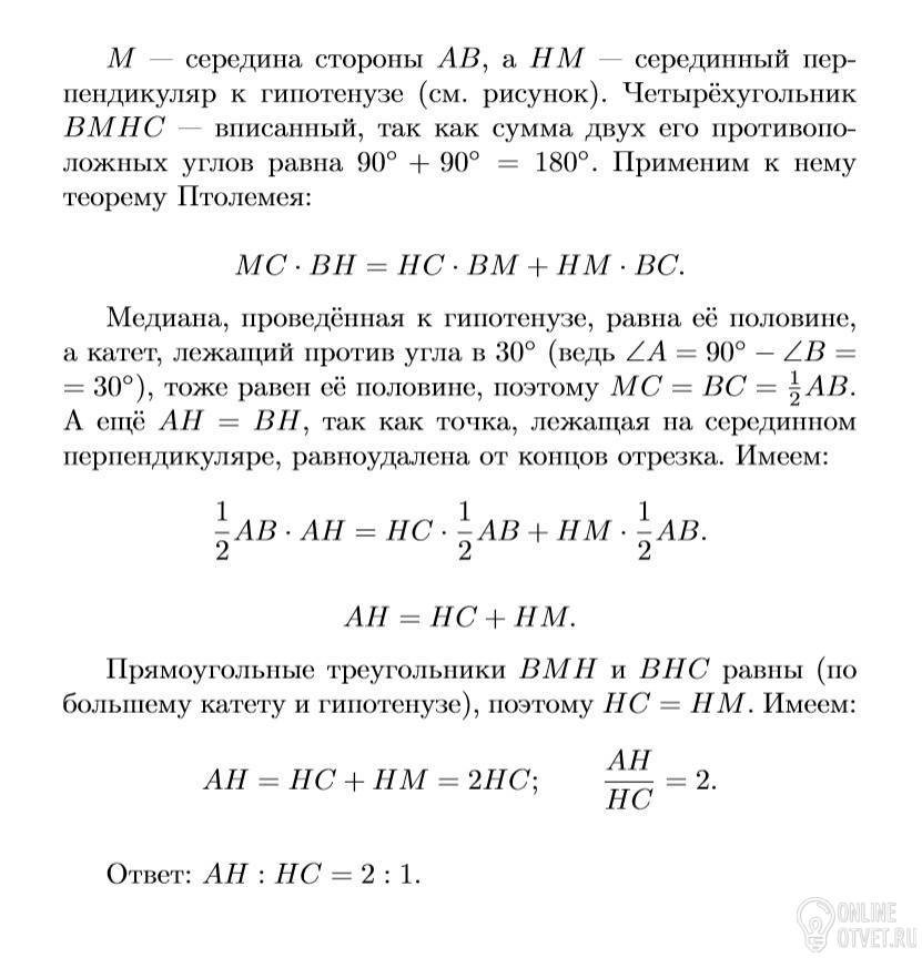 В прямоугольном треугольнике ABC с прямым углом C угол B равен 60 градусом. Найдите отношение AH : HC, где H - точка пересечения серединного перпендикуляра к гипотенузе с катетом AC