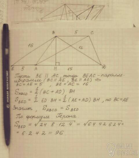 В трапеции длины оснований равны 5 и 15 см , а длины диагоналей 12 и 16 см . найдите площадь трапеции.
