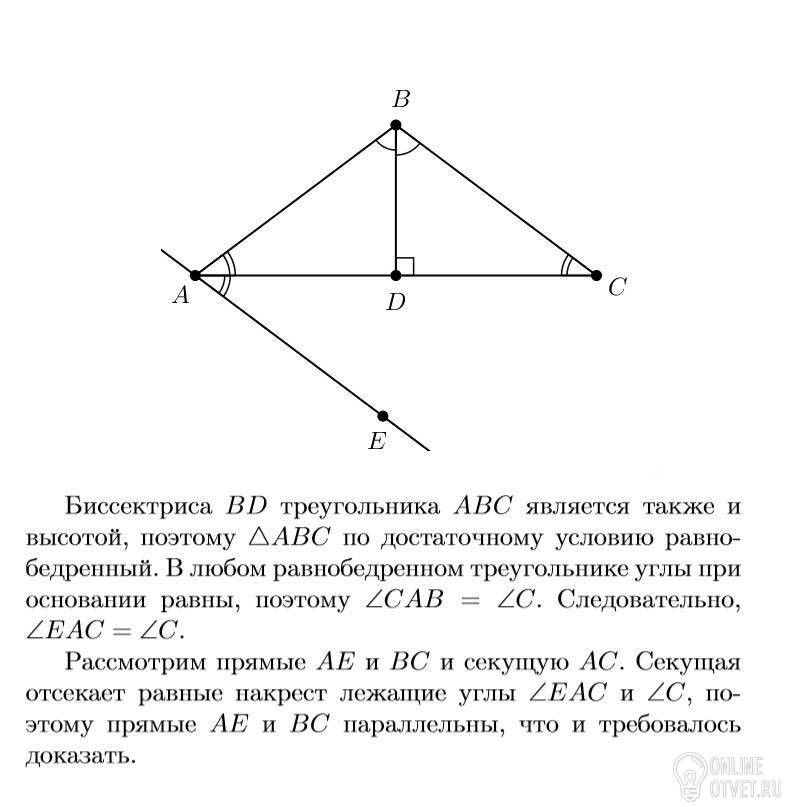 На рисунке угол ABD= углу CBD, BD перпендикулярно AC, AC биссектриса угла BAE. Докажите, что BC параллельно AE.