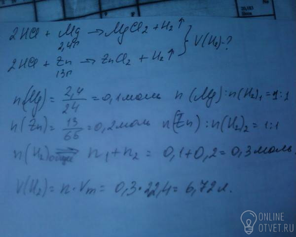 В соляной кислоте растворили 2,4 г магния и 13 г цинка. Определите объём водорода выделившегося при этом.