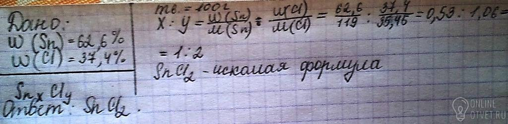 Массовые доли олова и хлора в хлориде олова равны соответственно 62,6 и 37,4%. Определите простейшую формулу хлорида.