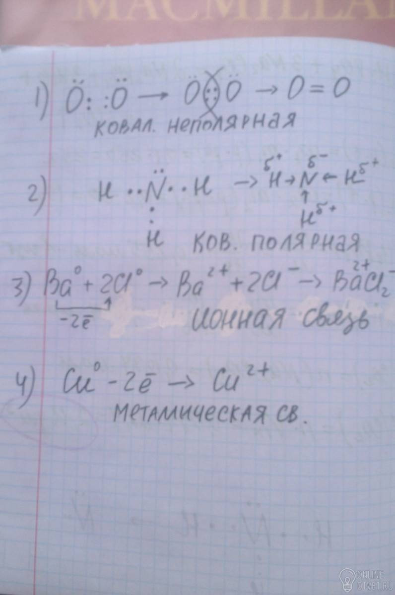 Определите вид химической связи для веществ:О2,NH3,BaCl2,Cu.для NH3 написать схему образования.