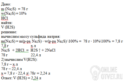 78 г 10%-го раствора сульфида натрия обработали избытком соляной кислоты . Какой обьем газа(л) при н.у. выделится в результате?