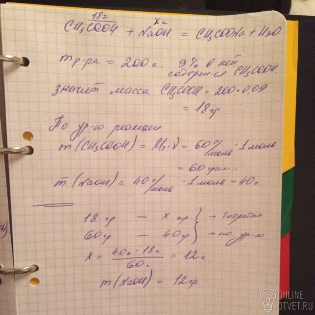 При нейтрализации 200г раствора с массовой долей уксусной кислоты 9% потребуется гидроксид натрия массой а)15,0г б)12,0г в)9,0 г)6,9