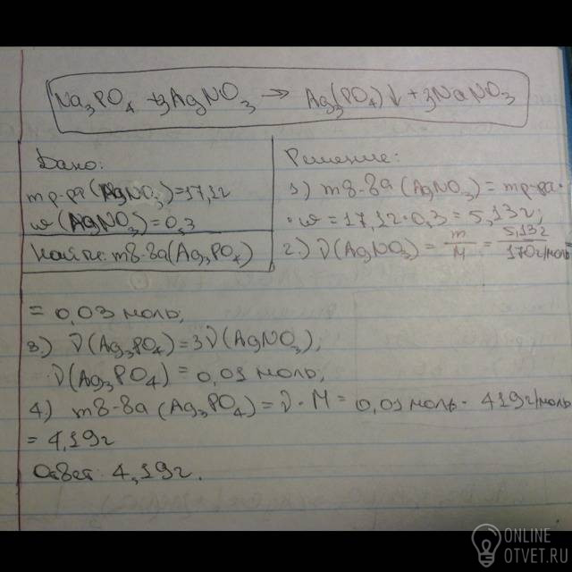Вычислите массу осадка, который образуется при добавлении избытка раствора фосфата натрия к 17,1 г 30 процентного раствора нитрата серебра.