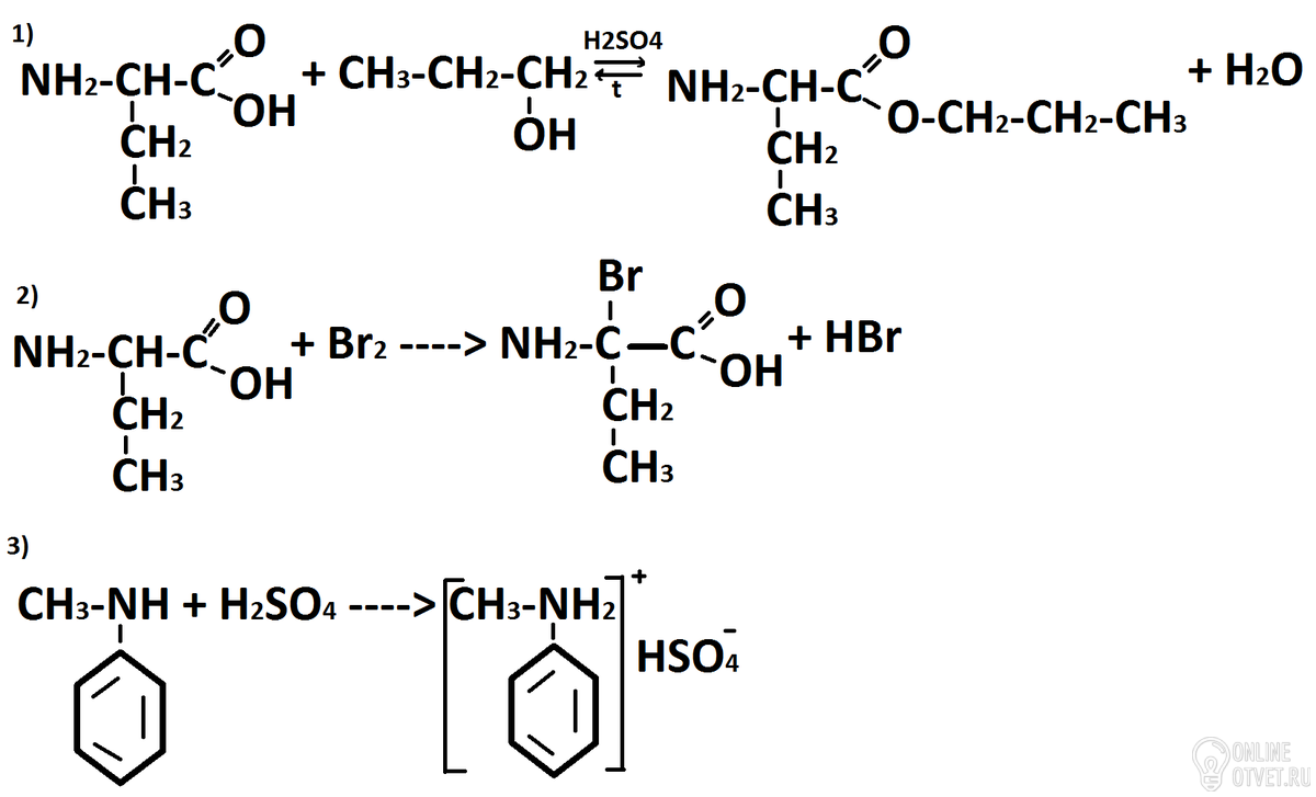 Напишите уравнения возможных реакций : между 2 - аминобутановой кислотой , метилфениламином, и следующими в-ми : пропанолом, бромом,серной кислотой.