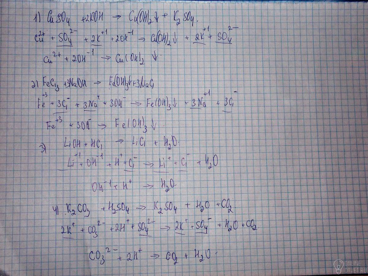 Составьте молекулярные, полные и сокращенные ионные уравнения реакций между растворами веществ:CuSO4 и KOH.FeCl3 и NaOH.LiOH и НС1.K2CO3 и H2SO4