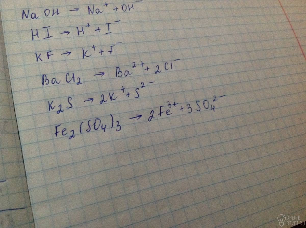 Напишите уравнение электролитической диссоциации следующих веществ:а)NaOH б)HI в)KF г)BaCL2 д)K2S е)Fe2(SO4)3