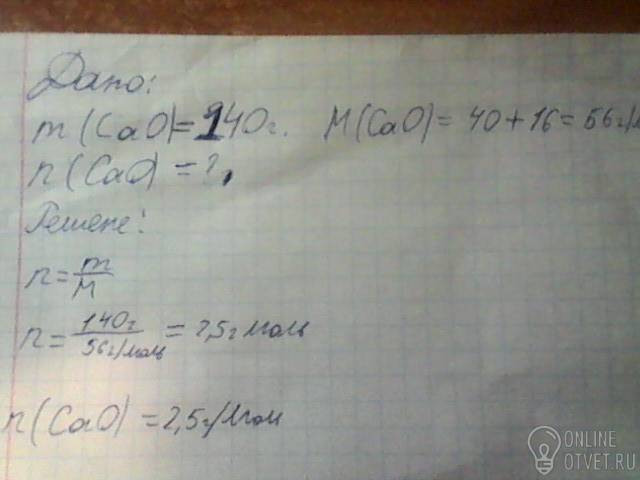 1Какое количество вещества оксида кальция СаО имеет массу 140г. Срочно нужно полностью решение пожалуйста