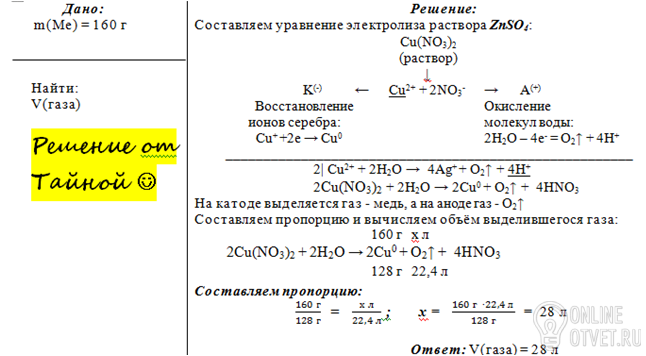 Вычислить объем газа, который образуется на аноде при электролизе раствора нитрата меди (2) если на катоде образовалось 160г металла.