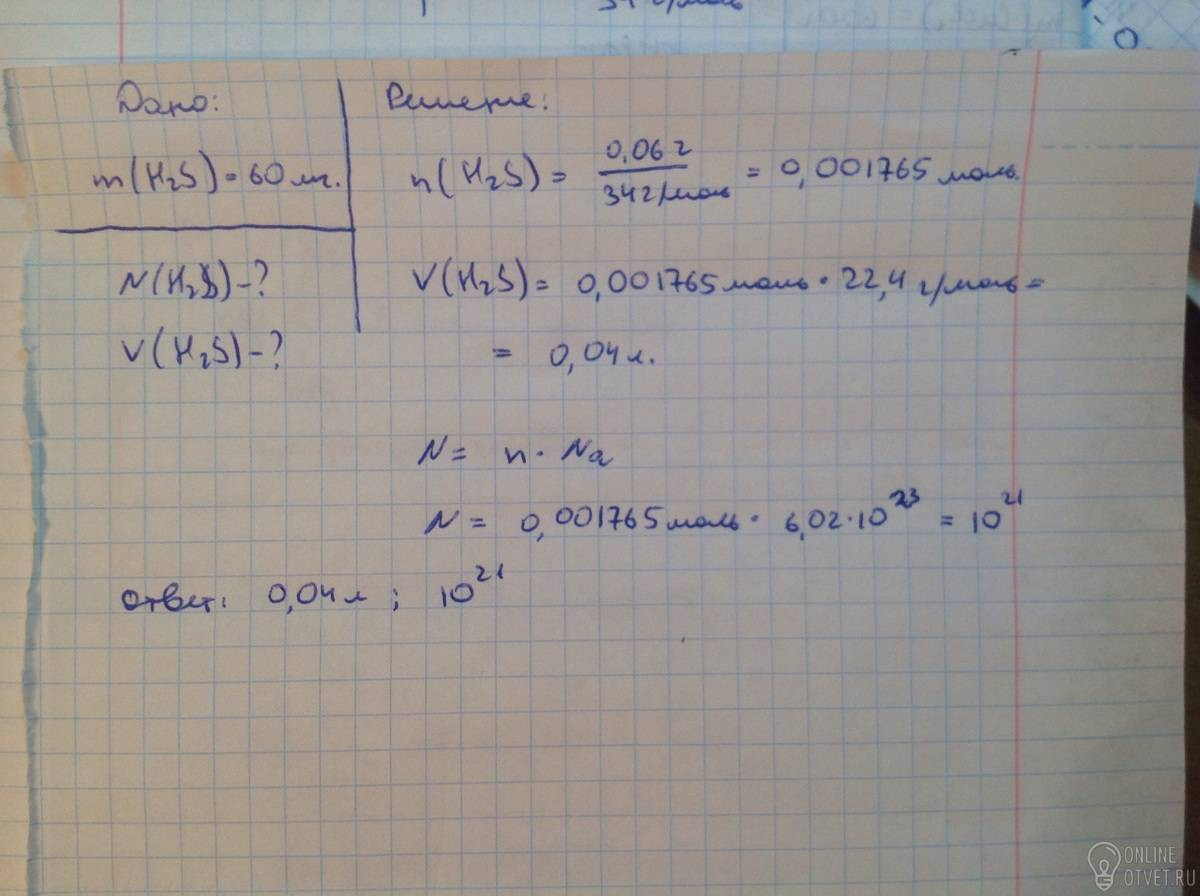 Найти при н.у. объем и количество молекул сероводорода массой 60 мг