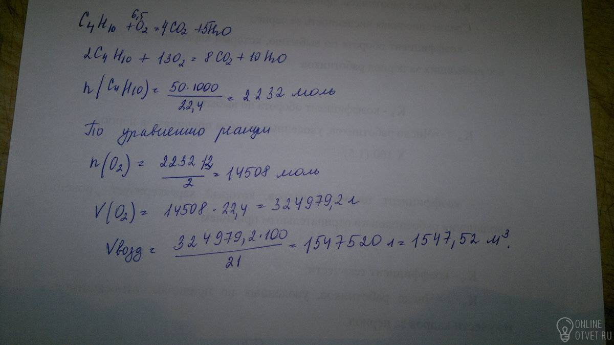 Вычислите объем воздуха, необходимого для сжигания бутана C4H10 объемом 50м3, если объемная доля кислорода в воздухе 21%