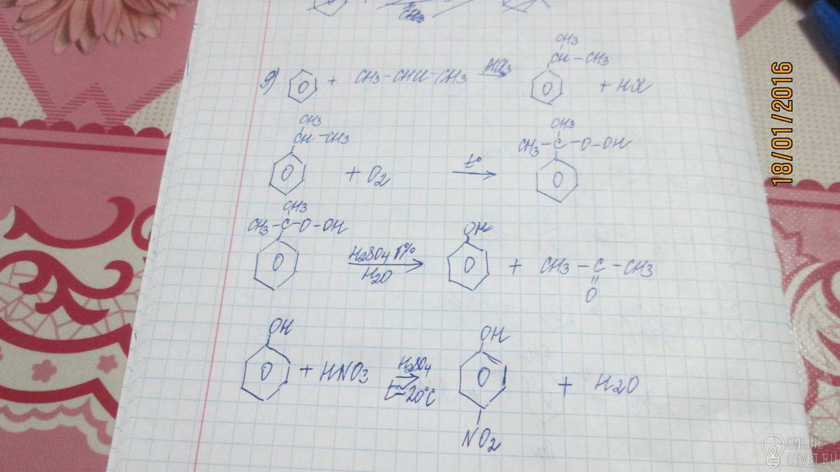 д) бензол -изопропилбензол(кумол) - гидропероксид кумола - фенол - n-нитофенол