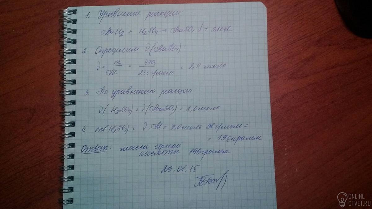 сколько грамм сульфатной кислоты вступило в реакцию с барий хлоридом, если масса осадка составила 470 грамм