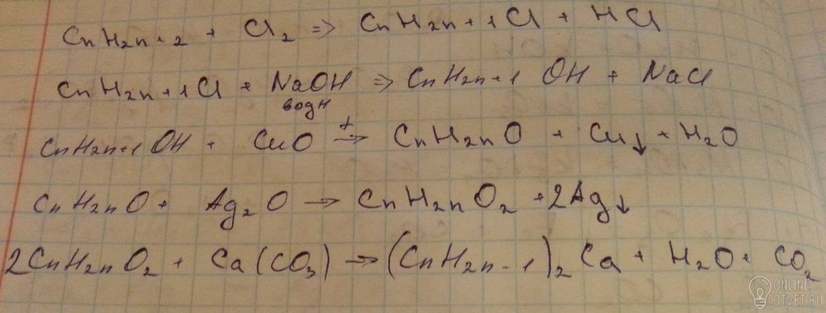 Помогите решить химическую реакцию :АЛКАН-ХЛОРАЛКАН-АЛКАНОЛ-АЛКАНАЛЬ-АЛКАНОВАЯ КИСЛОТА-АЛКАНАТ КАЛЬЦИЯ