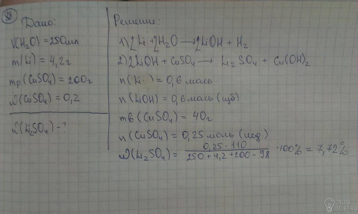 W (Li2SO4) = 27,5 / (250 + 4,2 + 200 - 24,5) = 27,5 / 429,7 = 0,064 или же 6,4%