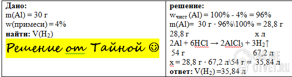 Вычислить v(h2) который выдиляется при взаимодействии 30 г al содержащего 4% примесей с hcl