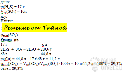 Вычислить объёмную долю выхода оксида серы (IV), если при горении 17 г сероводорода выделяется 10 л оксида серы (IV) (н.у.).