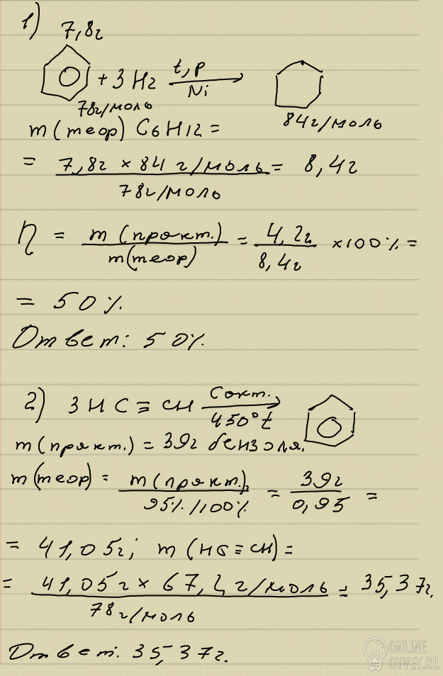 1)в результате гидрирования бензола массой 7.8 г образовалось 4.2 г циклогексана. Определить выход циклогексана.