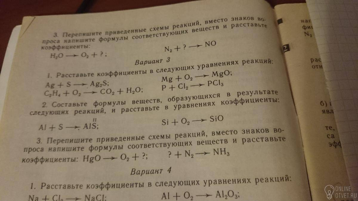 1). 2Ag+S=Ag2S 2Mg+O2=2MgO 2P+3Cl=2PCl3 2). 2Al+3S=Al2S3 Si+O2=SiO2 3).2HgO=2Hg+O2 N2+3H2=2NH3 Я не знаю,как это все объяснить,просто посмотри тему,связанную со степенями окисления и составлением уравнений.
