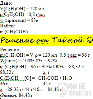При окислении 120 мл этанола (плотность 0,8 г/мл) с массовой долей примесей 8% образовался ацетальдегид. Вычислите количество вещества образовавшегося ацетальдегида.