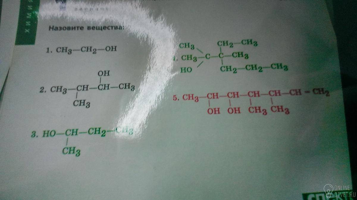 1) этанол, 2) 3-метилбутанол-2, 3) бутанол-2, 4) 2,3-диметил,-3-этилгесанол-2, 5) 3,4-диметилгептен-1,-диол-5,6