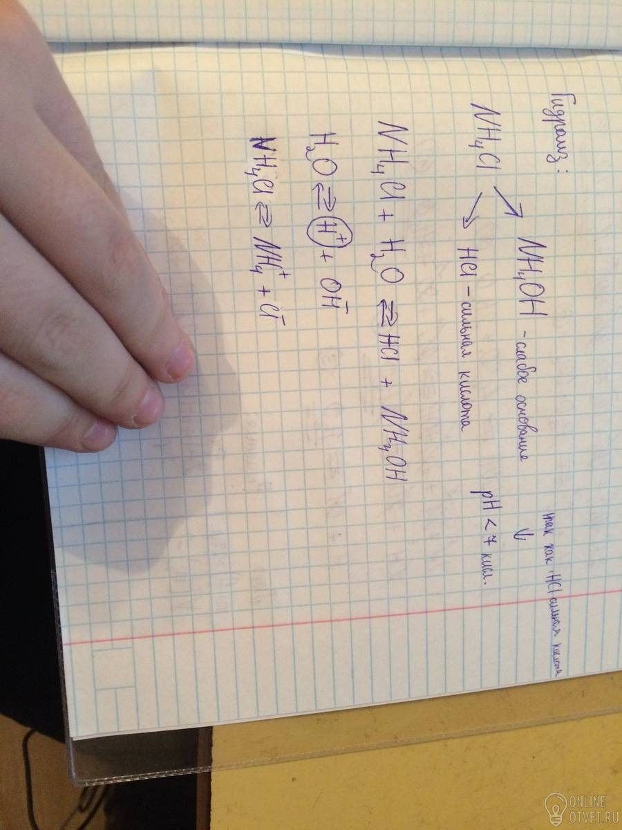 Запишите гидролиз соли NH4Cl. Какое значение рН (больше или меньше 7) имеет раствор этой соли?