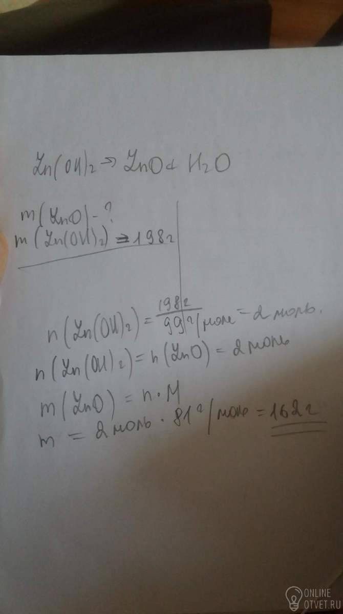 По уравнению реакции Zn(OH)2 = Zn O + H2O определите массу оксида цинка, который образуется при разложении 198 г исходного вещества.