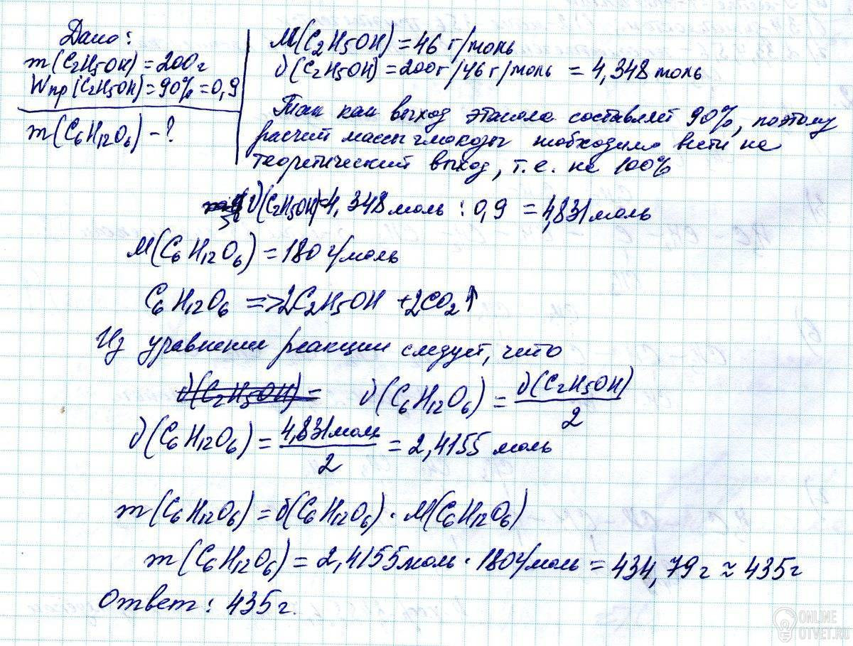 Во время спиртового брожения глюкозы получено 200г этанола с выходом 90%. Найдите массу глюкозы.