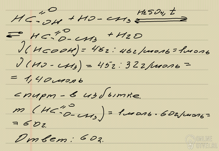 Муравьиную кислоту массой 46 г нагрели с метанолом массой 45 г в присутствии концентрированной кислоты. Масса сложного эфира, полученного в результате