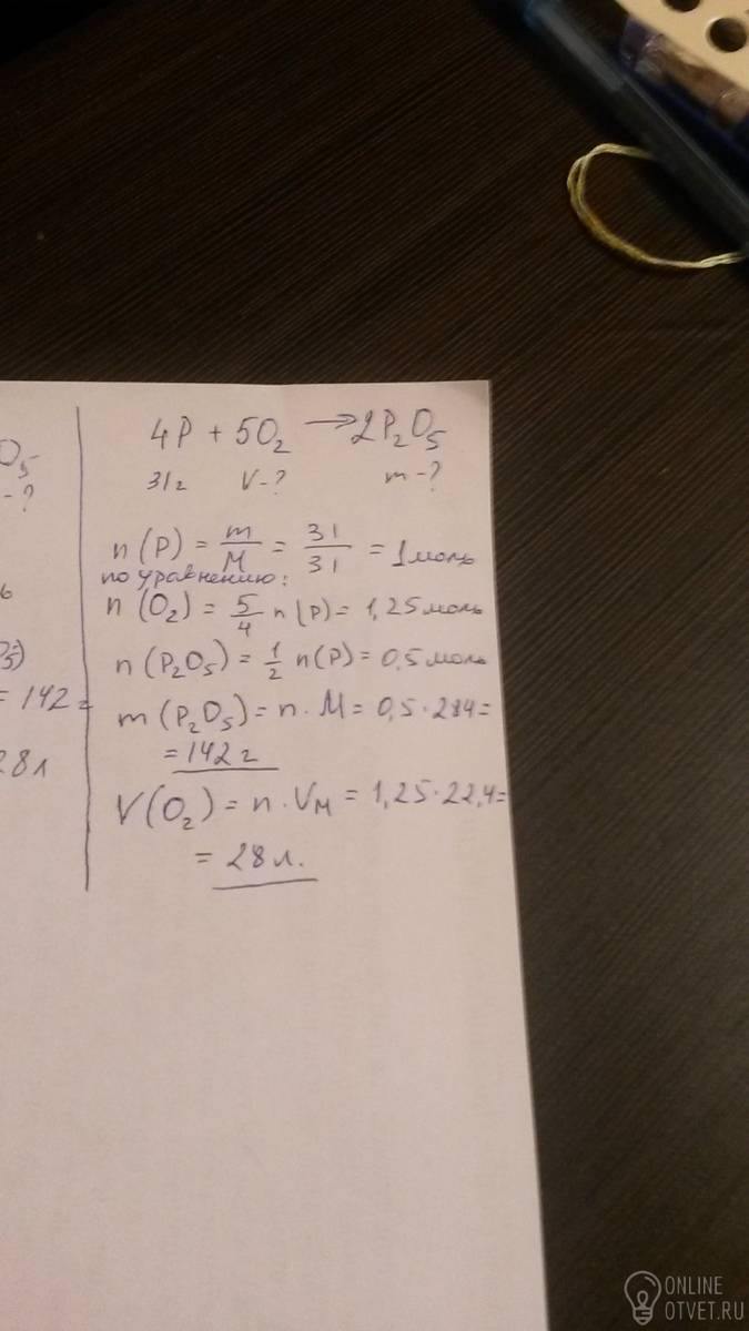 31г фосфора окисляется до оксида фосфора 5 валентного. Определите объем кислорода и массу оксида фосфора.